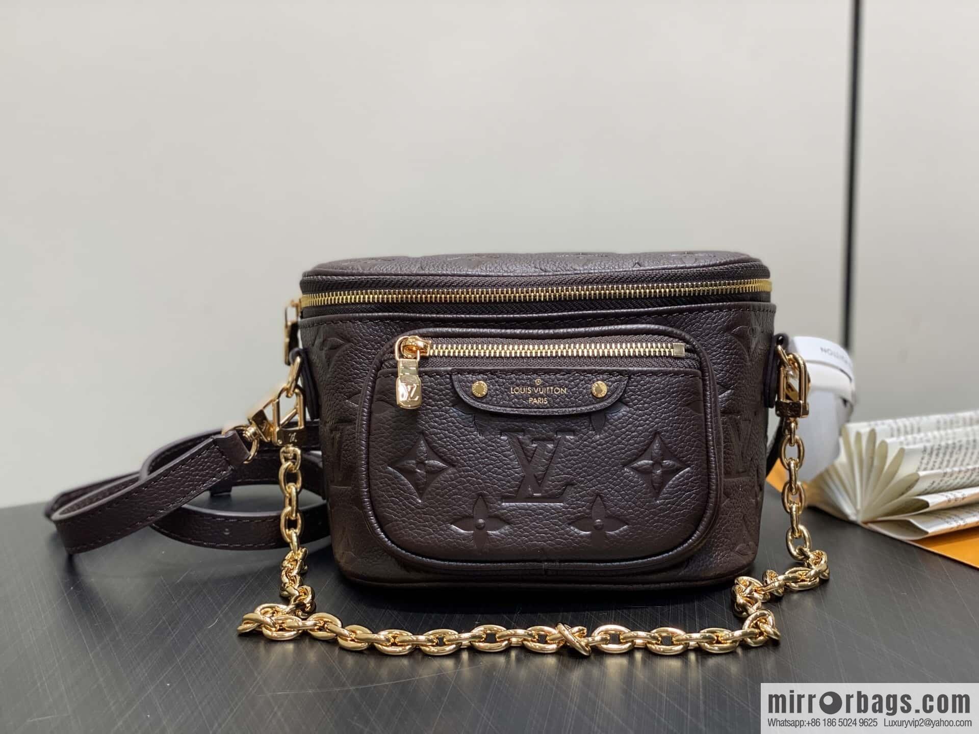 [Boutique‑grade] M13827 chocolate color, full leather embossed chain bag MINI BUMBAG fanny pack handbag M46917 m82335 85636 chocolate color (embossed) M82208 This Mini Bumbag handbag is from the LV Gradient series, rendering a gradual change in midsummer color for the Monogram embossing of Monogram Empreinte leather. The trendy configuration features a zipper main compartment, and Louis Vuitton leather labels embellish the front pocket. Use the removable chain and the removable and adjustable shoulder strap to convert the shoulder and back crossbody at will. Dimensions: 17 x 12 x 9.5cm