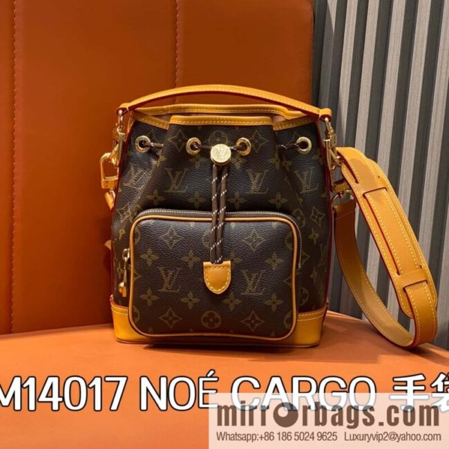 [Boutique‑grade] M14017 presbyopia yellow leather, medieval bucket bag NOÉCARGO handbag, Louis Vuitton Noé Cargo Jmlt bucket bag with Monogram canvas configuration and old-fashioned leather trim, inheriting the Noé bucket bag designed to carry champagne bottles in 1932. The large front bag and finely crafted details pay tribute to Louis Vuitton’s long history while meeting modern needs. The top handle and shoulder strap are removable for flexible portability. 24 x 16 x 22 cm