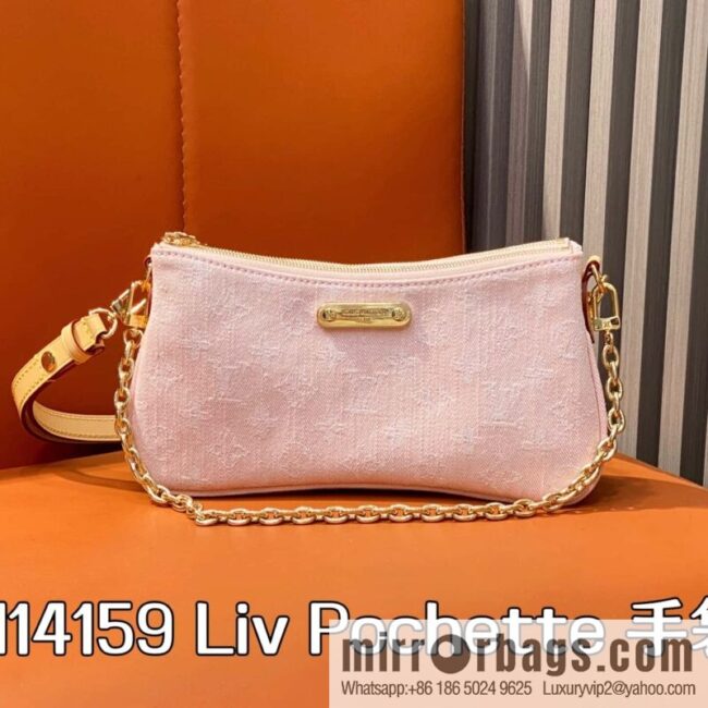 [Boutique‑grade] M14159 pink, denim underarm bag chain bag Liv Pochette handbag, this Liv Pochette handbag creates a retro style with elegant Monogram Denim fabric, highlighting new season ingenuity and can be carried comfortably under the armpit. The dazzling chain and adjustable shoulder strap are removable for a variety of styling possibilities, and the logo nameplate confirms the brand’s exquisite craftsmanship. 13.5 x 6.5 x 24.5 cm (height x width x length)