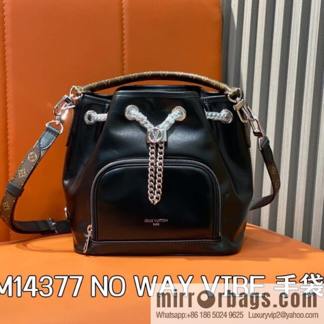 [Boutique‑grade] M14377 black, full-leather bucket bag NO WAY VIBE handbag, from the LV Vibe series, is a sheepskin integrated with translucent metal pieces, and rejuvenates the classic Noé handbag elements with modern rock style. LV Circle sliding decoration is easy to adjust the opening, and the zipper front bag can store keys and cosmetics at will. 22.5 x 15.5 x 24 cm (height x width x length)