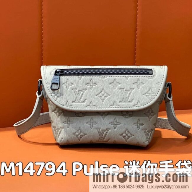 [Boutique‑grade] M14794 gray, full leather embossed men’s bag messenger bag Pulse mini handbag, this Pulse mini handbag is a modern new color dipped in Monogram Shadow embossed cow leather, which upgrades the elegant configuration and comfortable carry experience with soft texture. The zipper of the metal piece and the flip pocket cleverly fosters the bag body pattern, and the adjustable shoulder strap provides shoulder back and crossbody options. 16 x 5 x 22.5 cm (H x W x L)