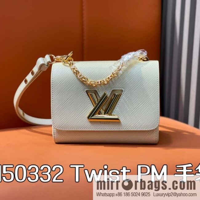 [Premium‑quality] M50332 meters white letters, water ripple Twist chain bag, this Twist PM handbag, made of Epi leather, has a unique ridge-like texture and is decorated with smooth cowhide. It is characterized by a highly refined style with a silver LV Twist turnlock and a personalized two-tone chain with letters. The breasts are well-spaced and feature multiple pockets, including a removable mirror and a zipper compartment for placing change or keys. Removable smart strap with adjustable shoulder back and crossbody. 19x 15x 9cm (L x H x W)